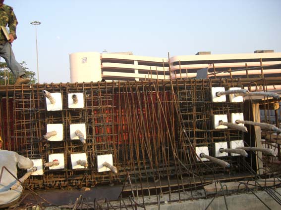深圳市皇岗口岸旅客及客车出入境场地改造工程,位于深圳市皇岗口岸。桥梁分高架桥和人行天桥,其中高架桥的第一、三、五联和人行天桥的1号、3号桥有预应力,束数有4、5、7、8、9、10六种束型。钢绞线下料长度最长约95m,最短约32m。结构形式采用等高现浇混凝土箱梁,梁高1.5m左右,两侧挑臂。梁体采用C50混凝土,张拉端锚具为OVM15-4~10,φs15.24mm钢绞线,强度1860MPa,波纹管内径55、70、80、90mm